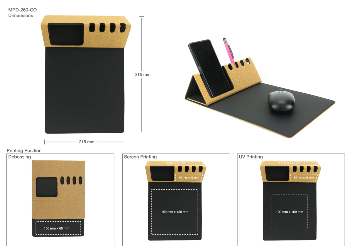 The Foldable Cork+PU Mousepad with Mobile and Pen Holder is a utilitarian and adaptable promotional item that effectively integrates practicality with environmental consciousness. The product provides a range of functionalities that enhance its utility as a valuable addition to the contemporary work environment. The following information pertains to the promotional gift in question: